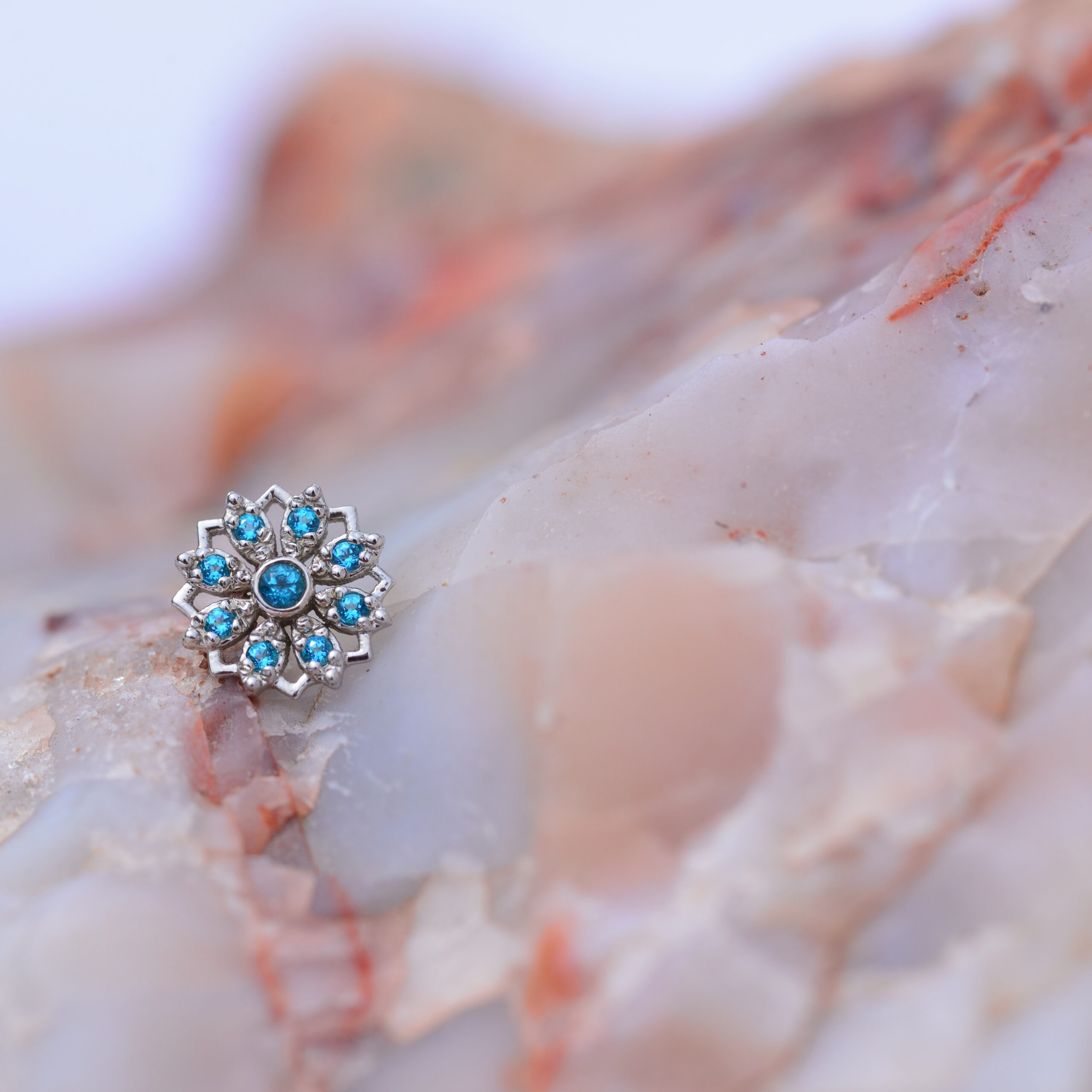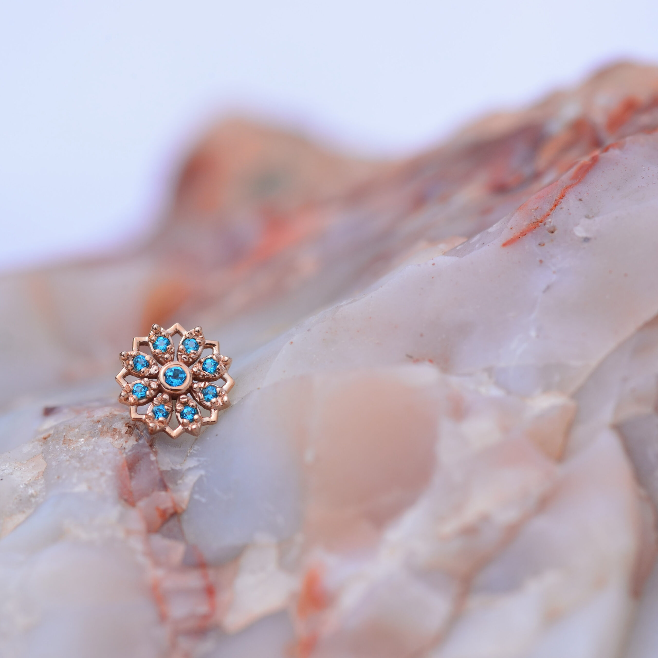 BVLA’s Rosette featured in either 14k Rose or 14k White with Genuine Paraiba Topaz gemstones. Piece can be special ordered in: * any color gemstones *color gold, also available in 14k and 18k * threaded or threadless