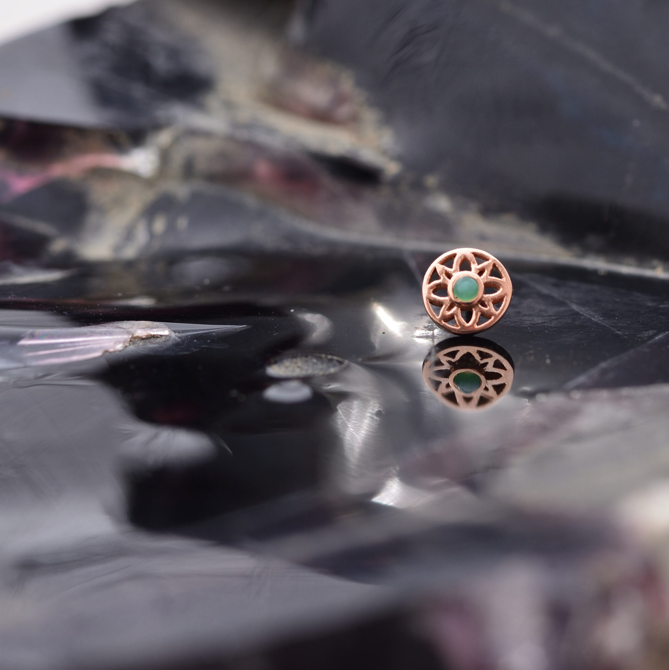 This BVLA Threadless Paloma Flower Solid 14k Rose Gold houses a 1.5mm Chrysoprase set within it’s 5mm diameter.