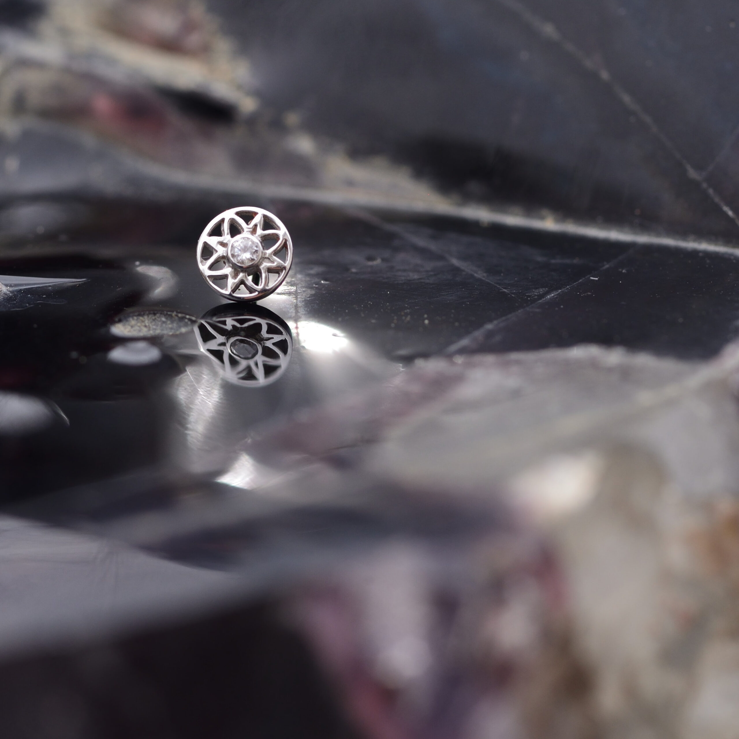 This BVLA Threadless Paloma Flower Solid 14k White, Rose and Yellow Gold houses a 1.5mm AA White Sapphire set within this 5mm diameter piece.