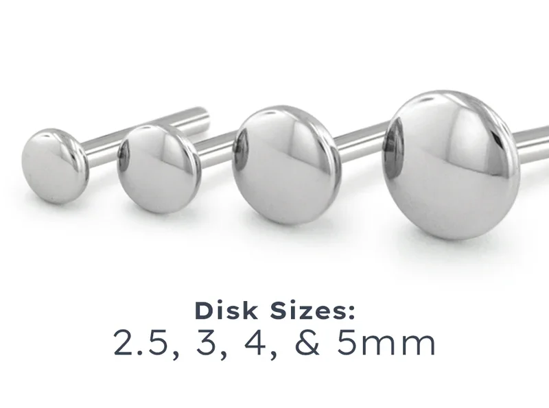 These classic threadless Disk ends are made from solid implant-grade titanium and feature a high-polish reflective surface or can be anodized multiple colors and are super flat.